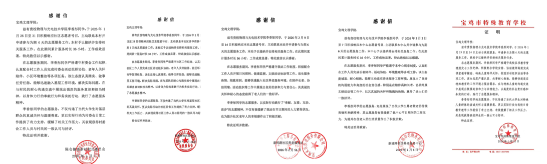 三月春风拂暖,雷锋精神永续。近日,太阳集团tyc53925级物理学专业李香彤同学先后收到新建路社区居委会、新建路社区养老服务中心、新民路社区养老服务站、陈仓镇进新村村民委员会及宝鸡市特殊教育公司发来的感谢信与证明,对其在寒假期间积极投身志愿服务、践行雷锋精神的行动给予高度肯定与赞扬。